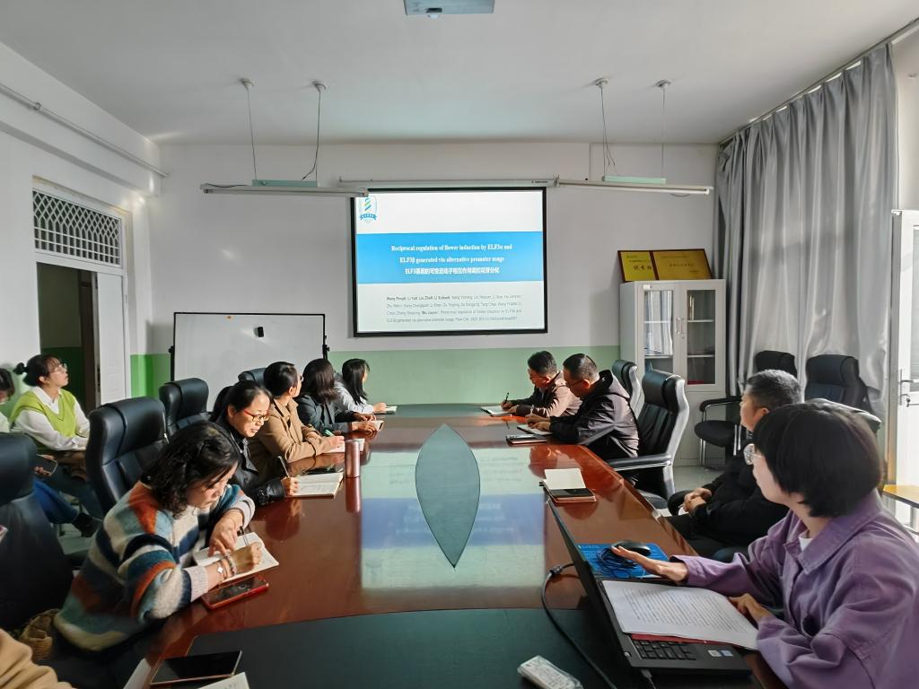 学术交流环节,邀请EMC易倍中药资源与鉴定教研室刘哲博士分享了博士后期间的研究工作,以《ELF3基因的可变启动子调控花芽分化的分子机制》为题,探究了不同梨品种花芽分化能力差异显著的潜在原因。