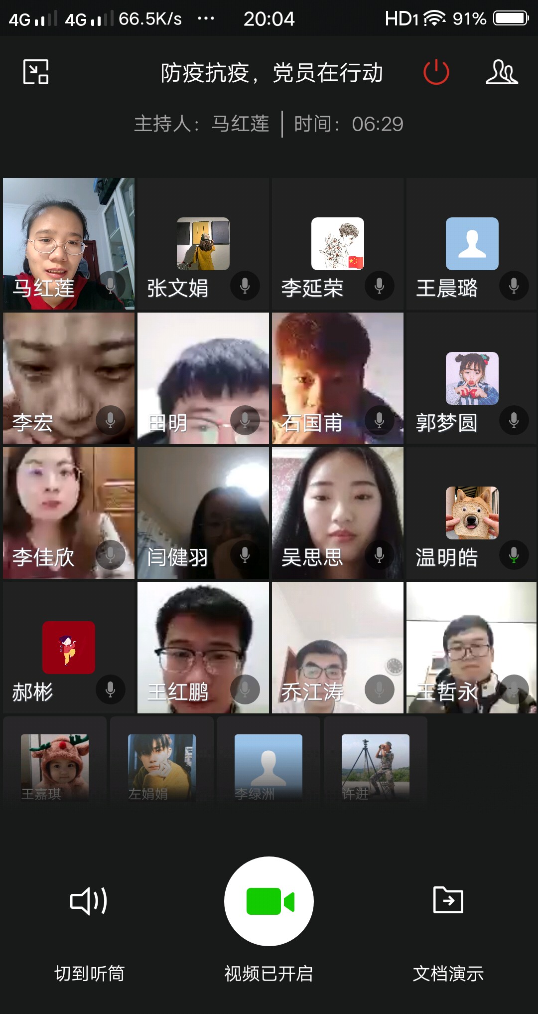 会议开始,马红莲老师带领全体党员共同学习了中共中央印发的《关于加强党的领导、为打赢疫情防控阻击战提供坚强政治保证的通知》、《习近平在中央政治局常委会会议研究应对新型冠状病毒肺炎疫情工作时的讲话》等疫情防控相关文件精神,以及教育部、公司有关疫情防控的通知要求。紧接着,员工党员依次进行交流发言,分享疫情期间的所做所想所感。如在当地参与疫情防控,协助登记排查、宣传防疫知识、测量体温、公共场所消毒等志愿者工作的经历和感受;最美逆行者,奋战在抗疫一线医护工作者的感人事迹;如何进行自我防护的知识和技巧;在家积极开展学习、准备考研复试的心得;“停课不停学”, 网络在线学习的方法和体会;疫情暴发以来由最初的焦虑、恐慌到平稳心态、充满信心、积极乐观的心理变化过程等等。各位党员积极发言,热烈讨论,纷纷表示,一定会坚定信心,不忘初心、牢记使命,当好先锋,为早日打赢疫情防控战贡献力量。最后党支部书记马红莲老师做总结发言,她肯定了同学们在疫情防控中发挥的积极作用和所作的努力,并号召全体党员要提高站位,继续发挥先锋模范作用,做疫情防控工作的宣传员、示范员、联络员。做到不信谣、不传谣、不恐慌,认真学习贯彻党中央决策部署和习近平总书记重要讲话精神,及时将疫情防控的有关信息传达给班级同学和身边亲友;主动协助辅导员做好疫情期间的各项工作,如健康天天报的填写,各种信息的收集;听指挥、守纪律,未经批准坚决不提前返校等;带头做好网络学习准备,自觉做到停课不停学,学习不延期,线上学习不掉线。此外,还告诫同学们虽然近期疫情形势好转,但还没有结束,仍不能放松警惕,要坚持少出门,戴口罩,不聚集,讲卫生,养成良好的作息习惯等等,用行动为“武汉加油”,为“中国加油”!