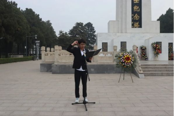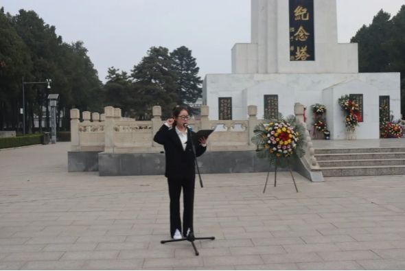 老师向革命烈士纪念碑敬献鲜花圈,表达对烈士的崇高敬仰和无尽哀思。同学们面向太行太岳烈士纪念塔,重温入团和入党誓词,用铿锵有力的誓言表达向先烈学习、弘扬革命精神的决心。