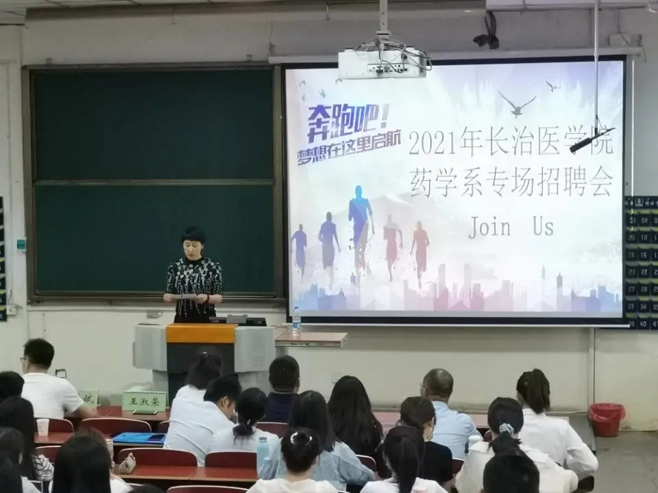 上海德普生物医药科技有限公司人事部经理潘修竹、山西亚宝药业集团股份有限公司招聘培训经理陈高辉、长治北大医疗潞安医院药学部原海忠、山西振东制药股份有限公司招聘经理崔哲昊分别介绍了企业概况以及同学们入职后的工作学习、成长路径、福利待遇和绩效等。宣讲会后四家用人单位进行了现场招聘,毕业生积极向意向单位投递了简历,并进行了深入沟通,近20名同学现场与用人单位达成了就业意向。