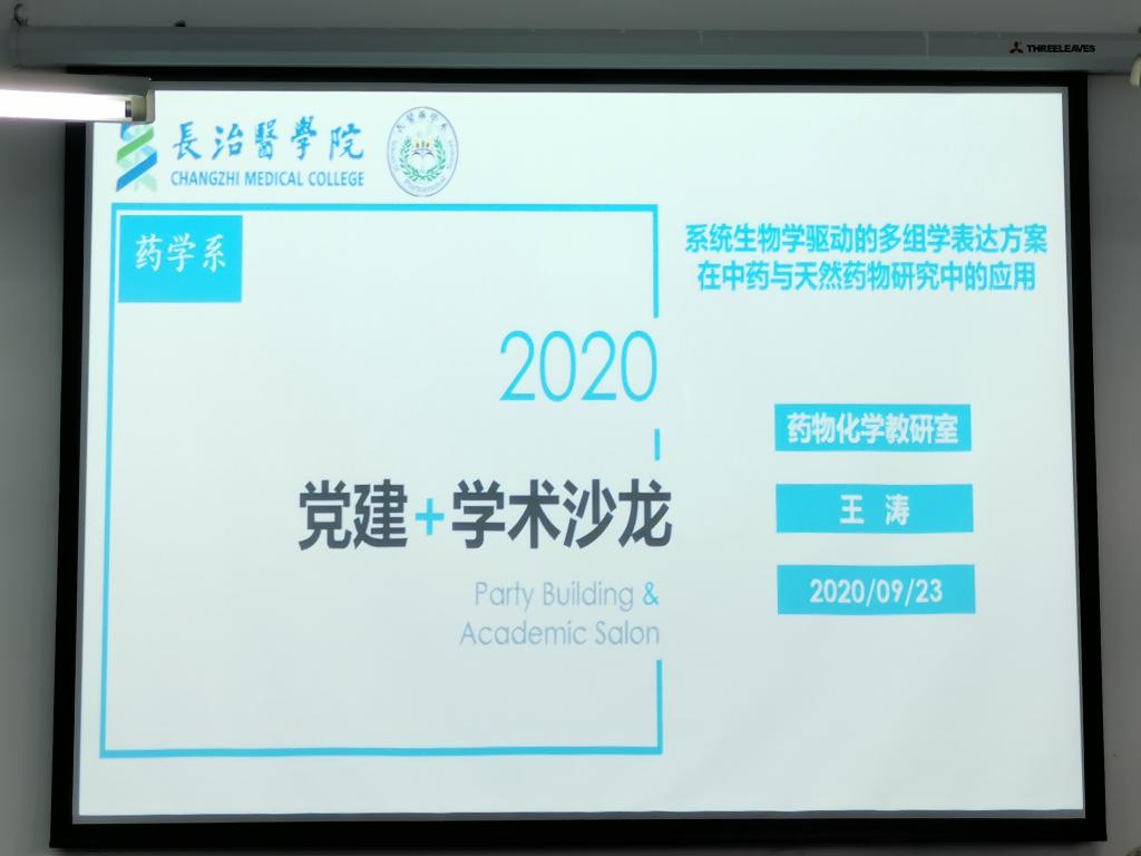 与会同志一同学习观看了“学习强国”平台推送的专题节目:《习近平谈治国理政》第三卷开篇之作《决胜全面建成小康社会,夺取新时代中国特色社会主义伟大胜利》。药学系药物化学教研室王涛副教授作了题为《系统生物学驱动的多组学表达方案在中药与天然药物研究中的应用》的交流报告,他根据系统生物学研究策略的原理和特点,结合案例及课题进展,围绕代谢组学+微生物组学在中药与天然药物药效作用评价和作用机制研究中的新应用进行了详细讲授。