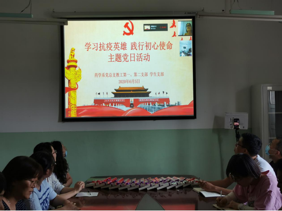 2020年6月5日下午,药学系党总支教工第一党支部、教工第二党支部及员工党支部联合举行了“学习抗疫英雄 践行初心使命”主题党日活动。教工党支部全体在岗党员在药学系会议室主会场参加活动,员工党支部党员、药学专业17、18、19级全体同学、辅导员、教师代表共400余人通过企业微信观看了活动直播。药学系党总支书记王淑荣以普通党员身份参加活动,活动由教工第一党支部书记张晓京同志主持。