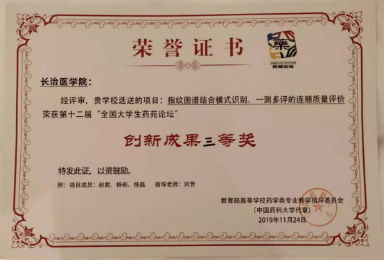 经过激烈的角逐,最终公司药学专业赵君等同学的参赛作品“指纹图谱结合模式识别、一测多评的连翘质量评价”项目荣获创新成果三等奖(指导老师:刘芳副教授),公司药学专业康繁鑫等同学的参赛作品“产地干燥方法对山楂叶中8种成分的影响” 项目荣获创新成果三等奖(指导老师:李囡囡副教授、宋丽华教授)。本次论坛充分展现了药学系学子饱满的精神风貌,展示了药学系学子的科学素养、专业技能和综合素质,凸显了药学人才培养的成效。