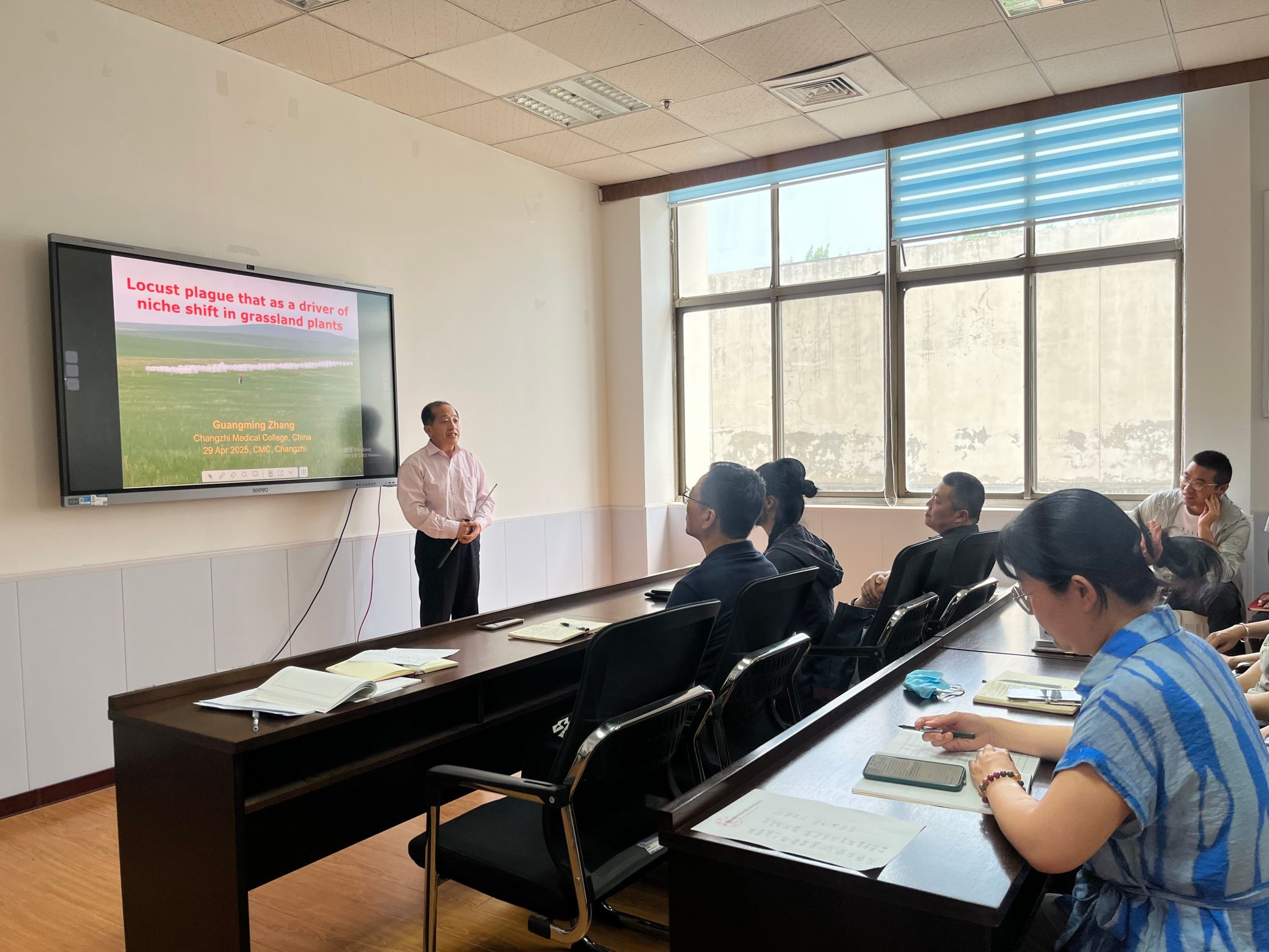 在本期学术报告环节,EMC易倍中药资源与鉴定教研室的张光明博士带来了题为《蝗灾对草原植物 C:N:P 化学计量生态位的影响》的精彩分享。张光明博士聚焦内蒙古锡林郭勒草原生态系统,详细汇报了不同程度蝗灾对常见植物C:N:P 化学计量生态位宽度和重叠的影响研究成果,并深入探讨了这些研究对于草原植物资源合理利用的重要意义。报告引发了在场教师的热烈讨论与深入思考。